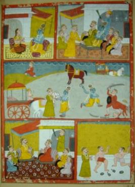 | Description / विवरण | Miniature painting based on the story of Bhagwat Purana depicting Krishna beheading Jarasandha with his chakra at the middle part. On the upper part Krishna is talking to a female and other royal persons. The lower part depicts two kings talking to each other and a king looking at two wrestlers. |