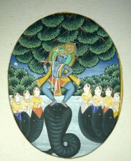 | Description / विवरण | Miniature painting depicting Sri Krishna dancing upon the head of Kaliya naga holding flute in right hand and left hand is resting on the waist. There are some naga kanyas worshipping Krishna. |