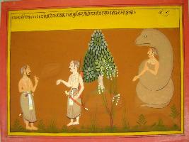 | Description / विवरण | Miniature painting based on Mahabharat - Vana parva depicting Dhaumya rishi and Yudhisthir talking and on the other side. Bhim is depicted held captive by Nahuk. |