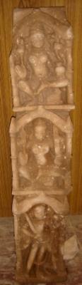 | Description / विवरण | Sculptured fragment of pillar having depiction in vertical row. From top a Four armed Parvati in Lalitasana. Her attributes from right below i Abhay mudra ii trident iii snake iv pitcher. Her vehicle Nandi is seen below her foot. b Saraswati in Lalitasana. Her attributes from right below i Abhay mudra ii lotus iii book iv pitcher. Her vehicle sworn seen below her foot c Bhairav having 4 arms and attributes from right below i dagger ii sword iii shield iv Narmunda, his vehicle dog is seen at his feet. |