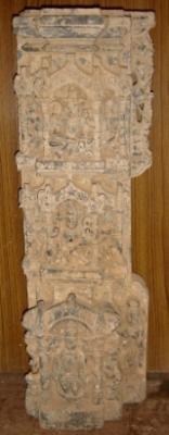 | Description / विवरण | Sculptured architectural fragment of a pillar depicting 3 images of Vishnu in different forms in pillared niche. Attributes of Vishnu of top one from right below - 1 Mace 2 Chakra 3 Lotus 4 Mace. Attributes of Vishnu bottom one from right below in standing pose in pillared niche - 1 Chopped off probably lotus 2 Conch 3 mace 4 Chakra. The upper two Vishnu are flanked by two female attendants in each side in low relief and the lower Vishnu is flanked by one female attendant at left side and one Vyala on each side. |