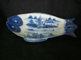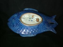 | Description / विवरण | Tray in the shape of fish, grey and dark blue. It is decorated with pictures of house, pond and boats. |