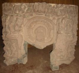 | Description / विवरण | Fragment of sculpture depicting lotus shaped halo of Vishnu probably at centre. To its right Brahma with his consort is depicted in tow relief, but faces of both are chopped off. To the left of the nimbus Shiva with Parvati probably is depicted in seated posture. It also depicts Varaha, Narasimha, Matasya and Kurma incarnations of Vishnu, along with celestial garland bearers on top and vyala figure at bottom on each side. |