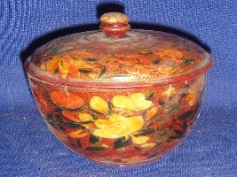 | Description / विवरण | Small, wooden container having a lid with knob, cylindrical in shape with footed base and painted with floral deigns in lacquered paint. |