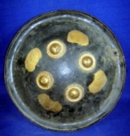 | Description / विवरण | Small circular shield made of iron having four phools bobs with punch marks and golden spots between the phools. |