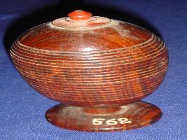 | Description / विवरण | Small wooden pot, oval in shape with a lid and a knob and a stand with a flat base. Body is having incised line designs. |