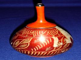| Description / विवरण | Wooden rattler, in brinjal shape, with floral designs. |
