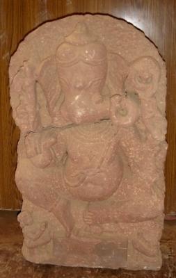 | Description / विवरण | An independent sculpture of four armed lord Ganesh seated in lalitasana. Attributes from right below i not clear but probably ankush ii Axe iii Lotus iv chopped off. It is broken into two parts from neck. He is adorned with jewels and Yajnopavit. His vehicle rat and two devotees are seen around his feet. |