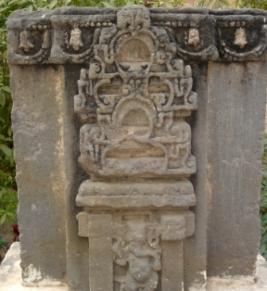 | Description / विवरण | Sculptured architectural fragment depicting four armed Ganesh in standing position. His attributes from right below i Missing ii axe iii ankush iv bowl. On the upper part architectural design with four bells are depicted. |