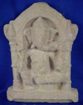 | Description / विवरण | Independent sculpture of four handed Ganesh seated in Lalitasana in pillared niche. His attributes from right below i lotus probably ii axe iii lotus iv bowl of sweets. The whole figure is slightly rubbed out. |
