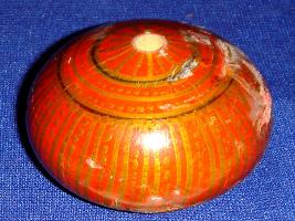 | Description / विवरण | Wooden top, a toy for children, with decorative designs. |