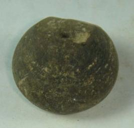 | Description / विवरण | Perforated terracotta bead, betel nut in shape, surface is rough and clay incrustation all over the body. |