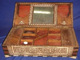 | Description / विवरण | It is a vanity box with eleven compartments and one mirror attached on its lid, except two compartments others do not have lid, inlay work of ivory on wood can be seen around mirror in floral designs. The outer part of the box has inlay work of ivory. |