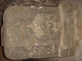 | Description / विवरण | Sculptured architectural fragment of a plinth four handed Shiva is depicted here holding trishul varada, snake and one hand missing face mutilated sitting in a pillared niche a mithuna couple in depicted embracing each other. |