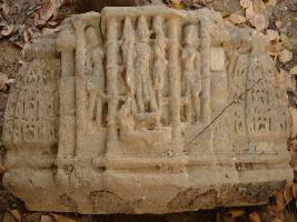 | Description / विवरण | Sculptured architectural fragment of a spire of a temple depicting four handed Shiva holding from right below 1 Varada mudra 2 trident 3 snake 4 Vajra. He is flaked by two female Shivganas. On the both side of sculpture is the two muni Shikhar carved. |