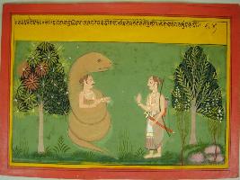| Description / विवरण | Miniature painting based on Mahabharat - Vana parva depicting the scene of Ajagar grabbing Bhim and Yudhisthir is asking him why is he doing so. |
