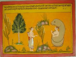 | Description / विवरण | Miniature painting based on Mahabharat - Vana parva depicting Yudhisthir is asking Ajagar that to leave Bhim. But Ajagar ask him to answer his questions, then only he will leave Bhim. |