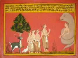 | Description / विवरण | Miniature painting based on Mahabharat - Vana parva depicting Yudhisthir along with a deer and a bird and with his brother ask Ajagar says his this condition is done by sage Agastsya. |