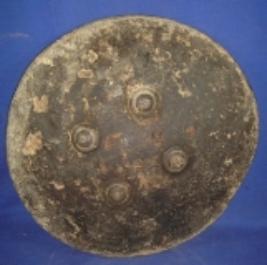 | Description / विवरण | Leather shield painted with black colour on the exterior with four metal bobs. The inner side is plain. |
