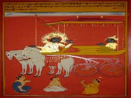 | Description / विवरण | Miniature painting based on Shri Bhagwat Gita. It depicts Krishna preaching Arjun that sacrifice is great and he like sacrifice for good of an another man. On the painting three men are seen in the lower part. |