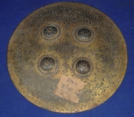 | Description / विवरण | Iron shield circular in shape having four bobs. The outer side is designed with engraved floral design. In the inner side a pad of cloth is fixed with iron knot. |