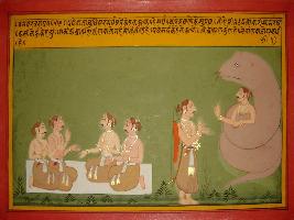 | Description / विवरण | Miniature painting based on Mahabharat - Vana parva depicting Yudhisthir is talking to snake who grabbed Bhim at the extreme left. At right part, four Brahmans are shown sitting and talking. |