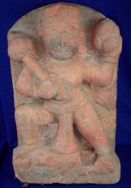 | Description / विवरण | Independent sculpture of Hanuman, carrying the Sumeru mountain in his left hand and holding the mace in right hand. His right leg is slightly bent. Traces of vermillion is seen on the whole sculpture. |
