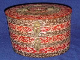 | Description / विवरण | Vanity box, having two compartments, one opening from the top and another from middle part. There is drawing in white colour on red and chocolate brown surface with flowers. It is cylindrical in shape. |