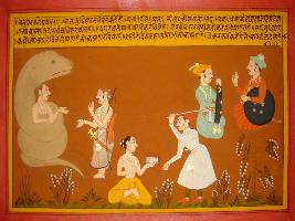 | Description / विवरण | Miniature painting based on Mahabharat - Vana parva depicting Yudhisthir is talking to snake who grabbed Bhim at right part. At the lower middle part a Brahman is shown sitting with a man hitting him with stick. At the upper left part, two men are shown sitting and talking. |