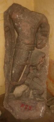 | Description / विवरण | Independent image of Hanuman in flying position. His head, right hand and left leg from thigh are broken. He is adorned with necklace, bracelet and a waistband in which a dagger is kept. Part of banmala is seen on his body. Near his legs female demon Sursa is seen praying him. Her figure is mutilated. |