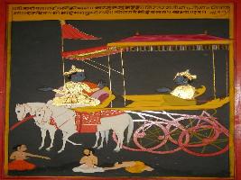 | Description / विवरण | Miniature painting based on Shri Bhagwat Gita. It depicts Krishna preaching Arjun that he who is always satisfied a yogi, and who conquered the senses and believe in him will attain him. |