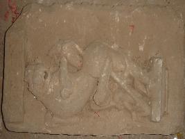 | Description / विवरण | Sculptured architectural fragment depicting Singh vyala and two men are depicted controlling him one from top and one from bottom. |