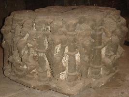 | Description / विवरण | Sculptured architectural fragment, part of a pillar depicting four armed Shiva seated in lalitasana. Attributes from right below 1 varada mudra 2 a trident 3 a snake 4 a fruit. At his both sides two female attendants are seen in Kartavyalambit mudra. To its left another dev figure is depicted seated in lalitasana with its face totally rubbed off. Two female attendants are seen at its both side, the head of the attendant at left side is mutilated. |