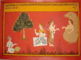 | Description / विवरण | Miniature painting based on Mahabharat - Vana parva depicting Yudhisthir is talking to snake who grabbed Bhim at the left part. At the middle part, a man is shown sitting. At the right part, a man is playing nagada. |