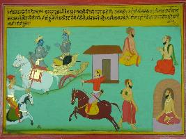 | Description / विवरण | Miniature painting based on Shri Bhagwat Gita. It depicts Arjun asking about difference between his Karma and Yogi s karma. Krishna told him that everyone does his karma and they are similar in a sense. Karma of yogi is to control his sense to meditate. He after controlling his sense, meditated with other sages. He asked him to follow sage. |