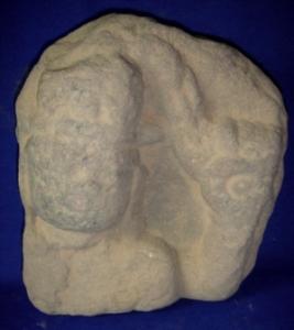 | Description / विवरण | Head of a male deity. The right hand and body below chest are missing. With his left hand he is holding something. It is almost completely rubbed out. |