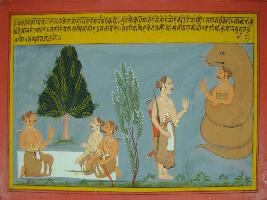| Description / विवरण | Miniature painting based on Mahabharat - Vana parva depicting the Nag raja asking question to Yudhisthir. |
