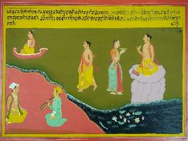 | Description / विवरण | Miniature painting based on Shri Bhagwat Gita. It depicts Manu is sitting with another man carrying at lower right part. At the upper left part, a sage is shown sitting on rock with a woman is shown coming with a plate to him. To its left, he is shown leaving. He is shown leaving in viman and going to heaven at upper right part. |