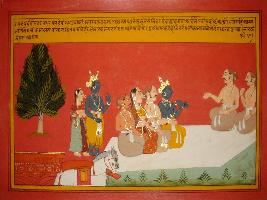 | Description / विवरण | Miniature painting based on Mahabharat - Vana parva depicting that Pandavas are going to vanvas and meet two Brahmans. In the meantime Krishna and Satyabhama come there and tell Pandavas that Markandeya muni will come. |