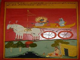 | Description / विवरण | Miniature painting based on Shri Bhagwat Gita. It depicts Krishna preaching Arjun that people should do their Karma without thinking of phal. This is mine bet advice. |