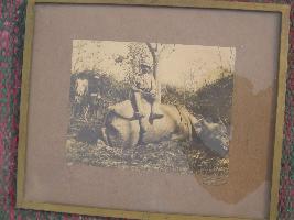 | Description / विवरण | This is a photograph of H.H. Ganga Singh ji sitting on a rhinoceros and two servant standing on the back of Ganga Singh ji. Rhinoceros is lying on grass. |