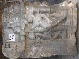 | Description / विवरण | Sculptured architectural fragment of a part of door jamb depicting a female dancer between two pillars right side of it a figure in standing posture. Left side corner a female dancer upper portion of the figures architectural design curved on it. |