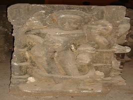 | Description / विवरण | Sculptured architectural fragment part of corner pillar depicting four handed Bhairav in standing position. Attributes from right below 1 a club 2 a club 3 a shield 4 a kamandal. At the left of it another four handed god is depicted. Attributes from right below 1 varada mudra 2 a club 3 not clear 4 chopped off. He is adorned with jewels and his vahan is seen behind in legs. |