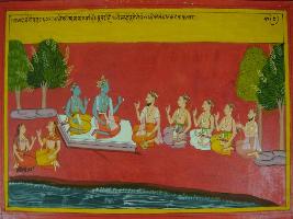 | Description / विवरण | Miniature painting based on Mahabharat - Vana parva. The painting depicts that Krishna is talking with Pandavas where Draupadi is also seen. Where Krishna asks the Pandavas to maintain Dharma in all time. |