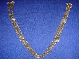 | Description / विवरण | Metal buttons, used on the upper garment of males. Three heart shaped buttons are joined by five strings of chain. Both the ends have ghungaroos . It is traditional ornament of Girasiya tribe. |