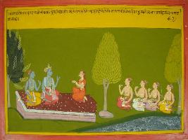| Description / विवरण | Miniature painting based on Mahabharat - Vana parva. The painting depicts Krishna with Pandavas and Krishna is asking Draupadi to line my peacefully with Pandavas. |