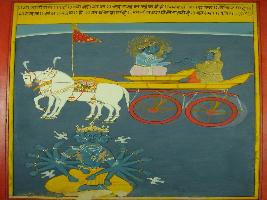 | Description / विवरण | Miniature painting based on Shri Bhagwat Gita. It depicts Krishna preaching Arjun that he is always present in all human beings - in hands, eyes, face etc. |