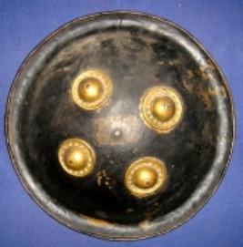 | Description / विवरण | Small circular brass shield with four bobs painted with golden colour. The shield is painted with black colour on exteriors. At the backside two small rings are made to hold the shield. |