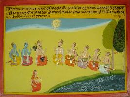| Description / विवरण | Miniature painting based on Mahabharat - Vana parva. On the painting Pandavas are talking with Markandeya muni and Nardev while Krishna and Draupadi is also seen. |