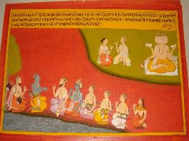 | Description / विवरण | Miniature painting based on Mahabharat - Vana parva. This painting depict Markandeya rishi talking to Yudhisthir. They are shown sitting with rest of Pandavas, Draupadi and Narad Muni at the lower part. At the upper left part, Brahman is shown sitting. To its right, king is shown sitting with Brahman. |